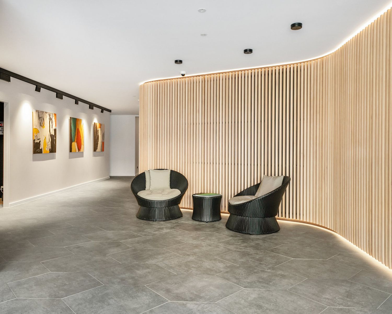 Modern Design: Step inside and be greeted by a stylish and contemporary interior. The studio exudes elegance and functionality, with neutral color tones and floor-to-ceiling glass panels that allow ample natural light to flood the space, creating an inviting and open atmosphere.
